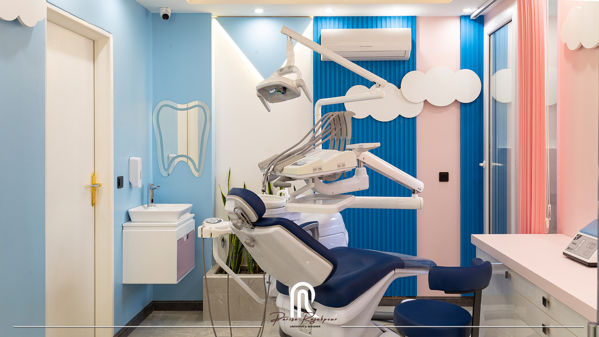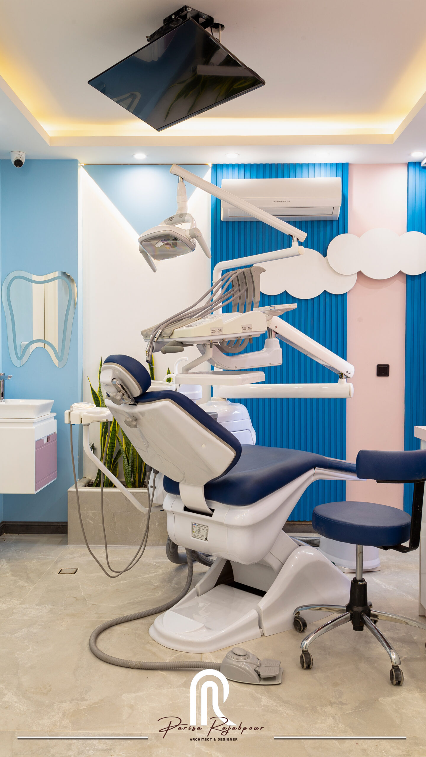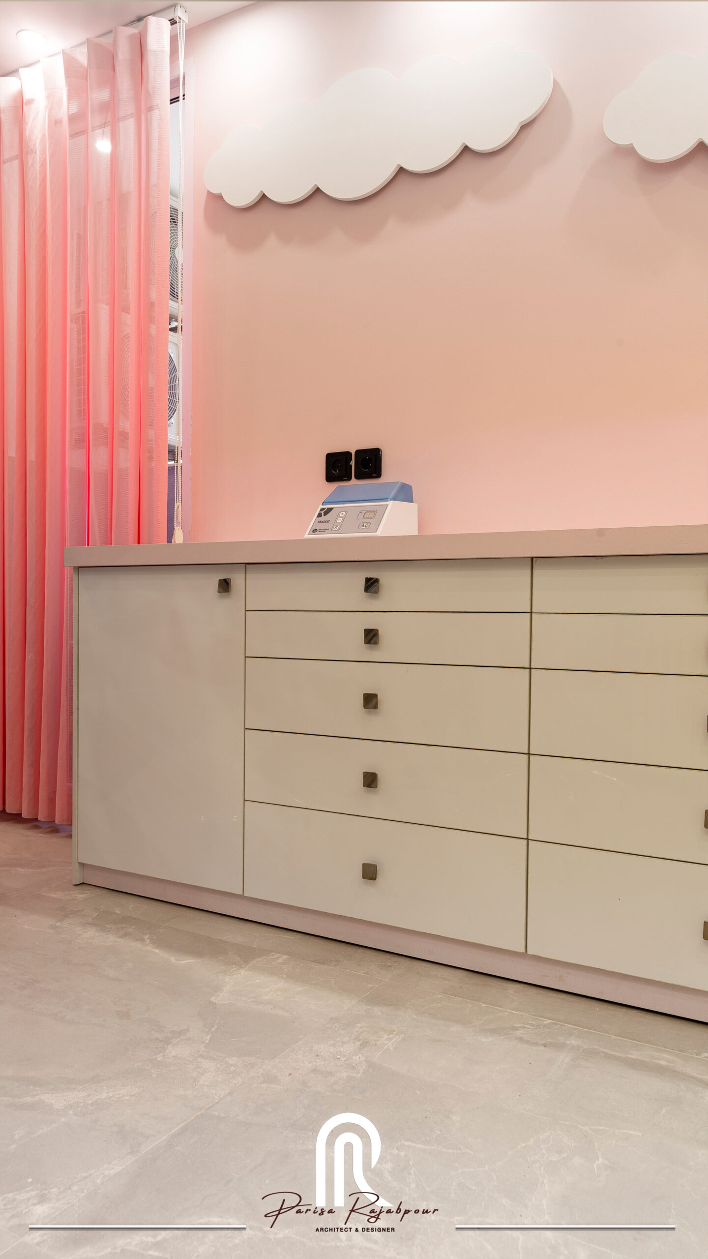 In the children’s room, the use of pink and blue introduces a cheerful, neutral environment where both boys and girls can feel comfortable. Elements such as cloud motifs and playful decorative shapes create an imaginative and reassuring world—one that tells the child they are safe and can begin their treatment with a smile.