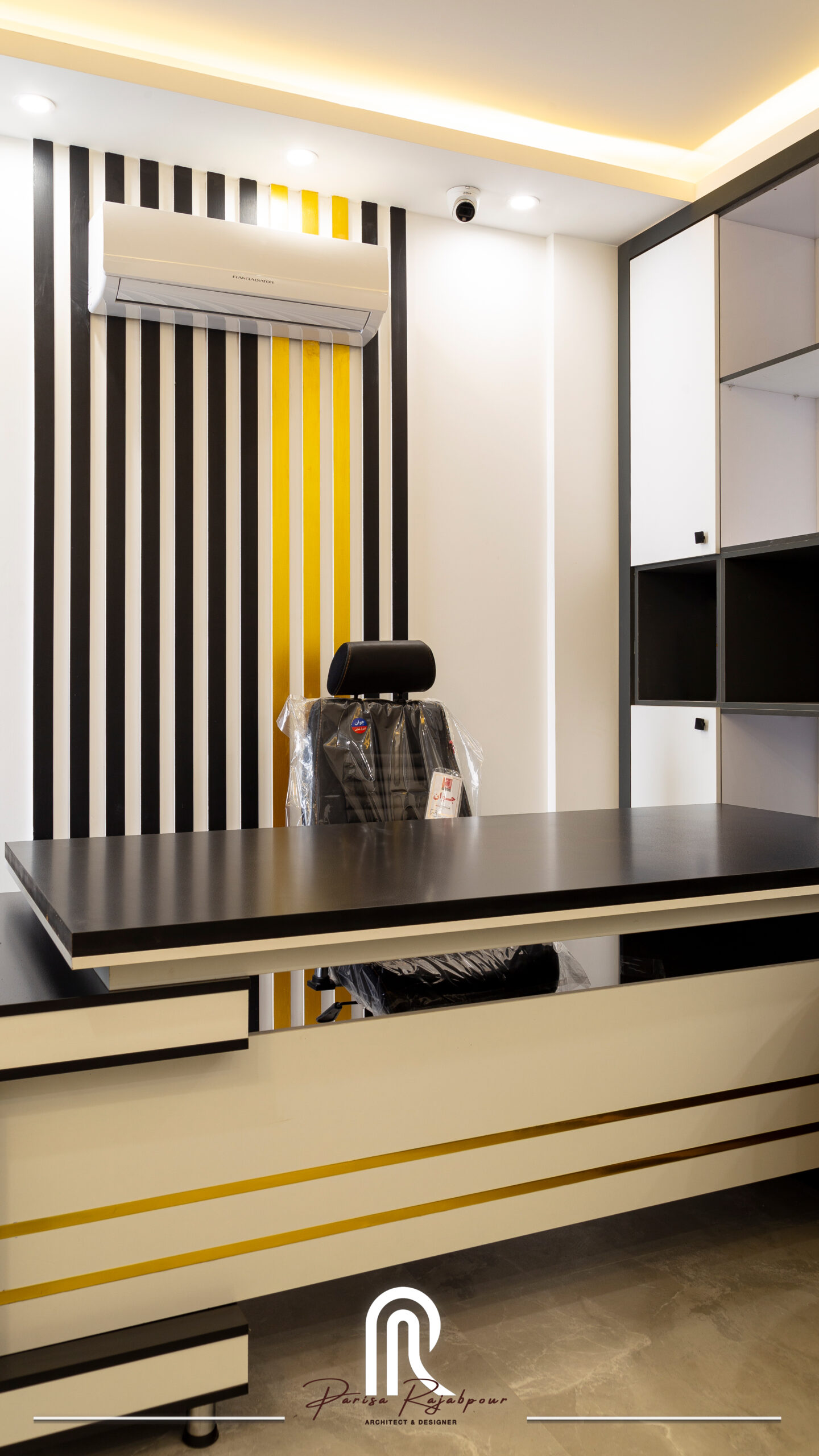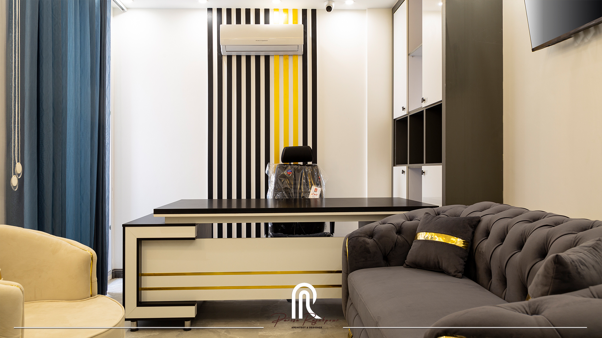 The management area, dominated by black with golden linear details, conveys a more formal and dignified mood. Black emphasizes focus and authority, while golden lines, like delicate highlights, add warmth and subtle elegance. This controlled contrast between depth and radiance creates an environment that is both professional and refined, yet still retains an undertone of intimacy.