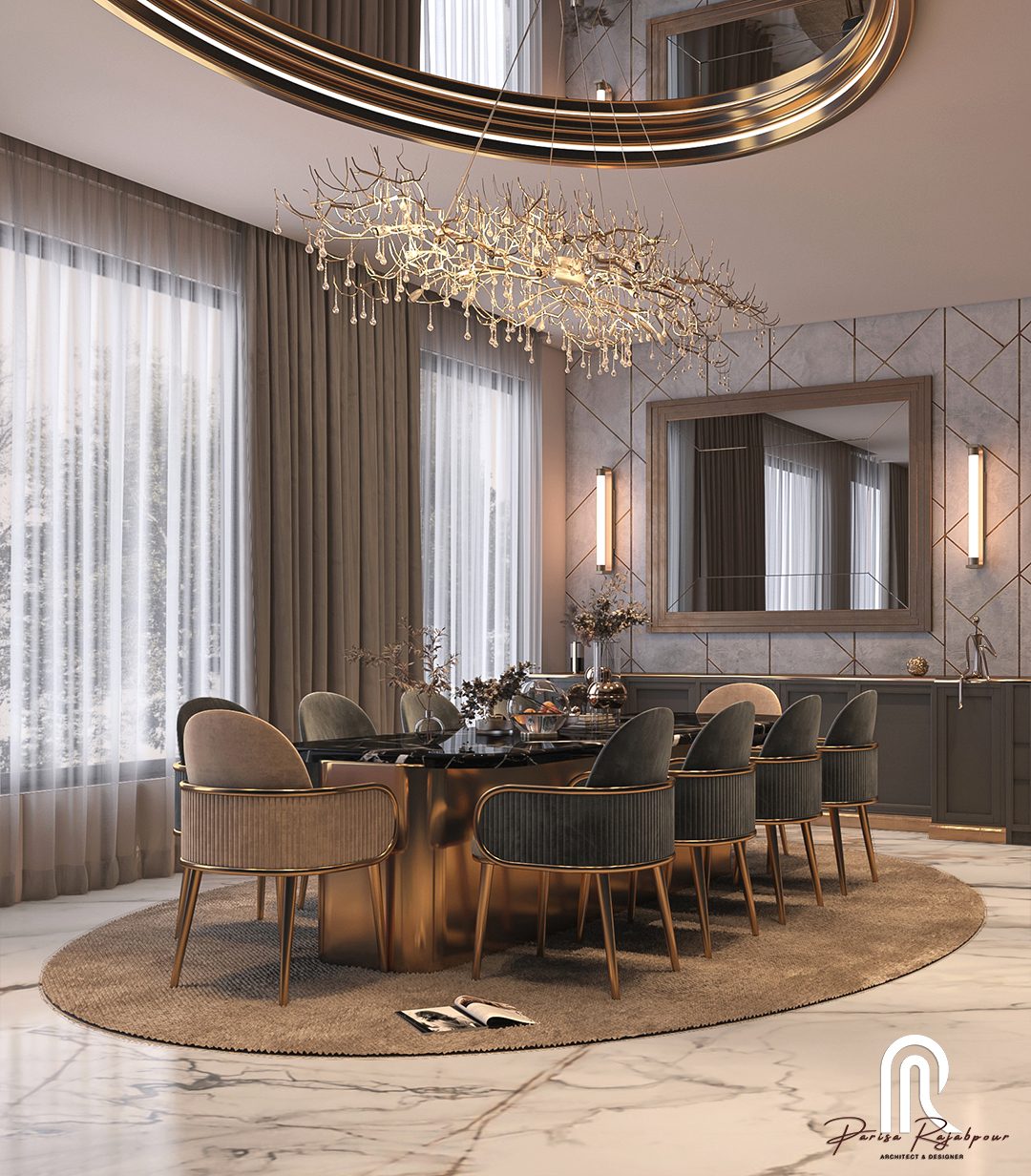 The considerable height of the walls lends the space a sense of grandeur, providing the perfect canvas for a uniquely designed ceiling. Directly above the main seating area, the ceiling features special detailing with an oval-shaped mirror at its center; a mirror framed with golden–copper accents that harmonizes beautifully with the console mirror and the dining table. This composition not only amplifies the sense of luxury, but also strengthens the visual coherence of the space.