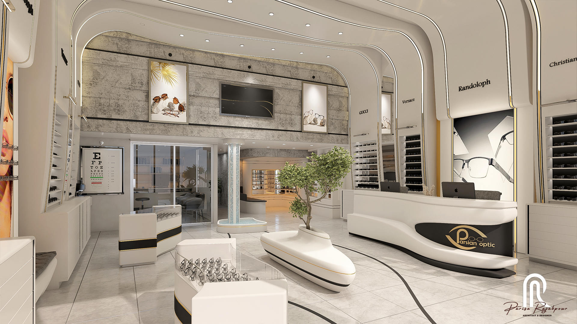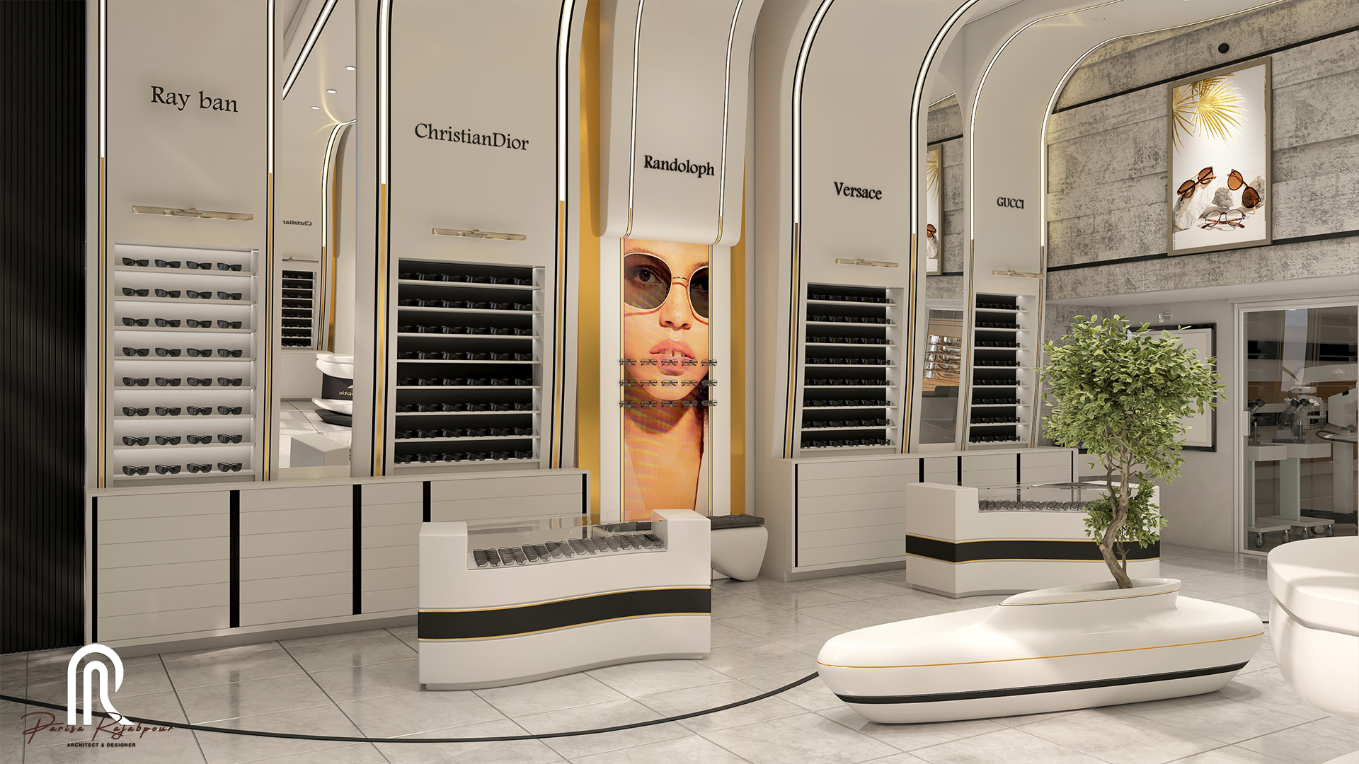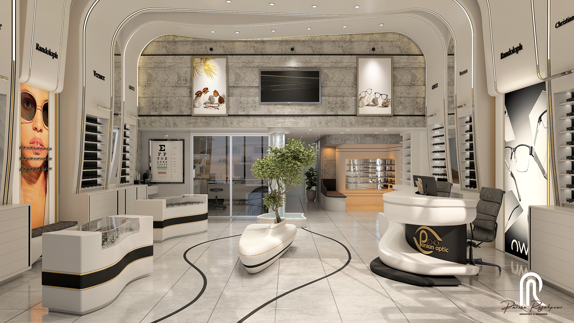 In this project, organic and fluid curves have replaced rigid lines and repetitive forms, pushing static geometry to the margins. The curves begin from the eyewear shelves, extend across the ceiling, and flow back down to the opposite shelves. This fluid rhythm injects a sense of movement and dynamism into the space, creating a unique visual experience for visitors. To emphasize this flow, concealed linear lighting has been integrated—starting from the shelving units, continuing across the ceiling, and guiding the eye to create a striking spatial depth.