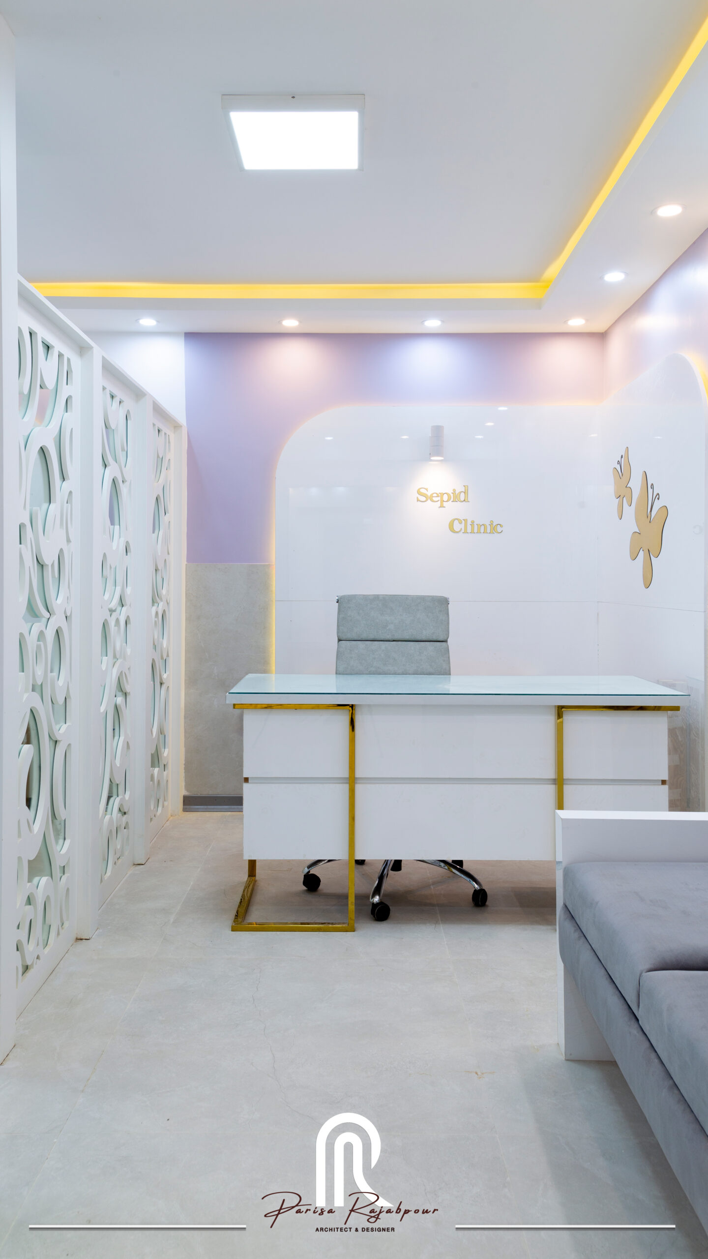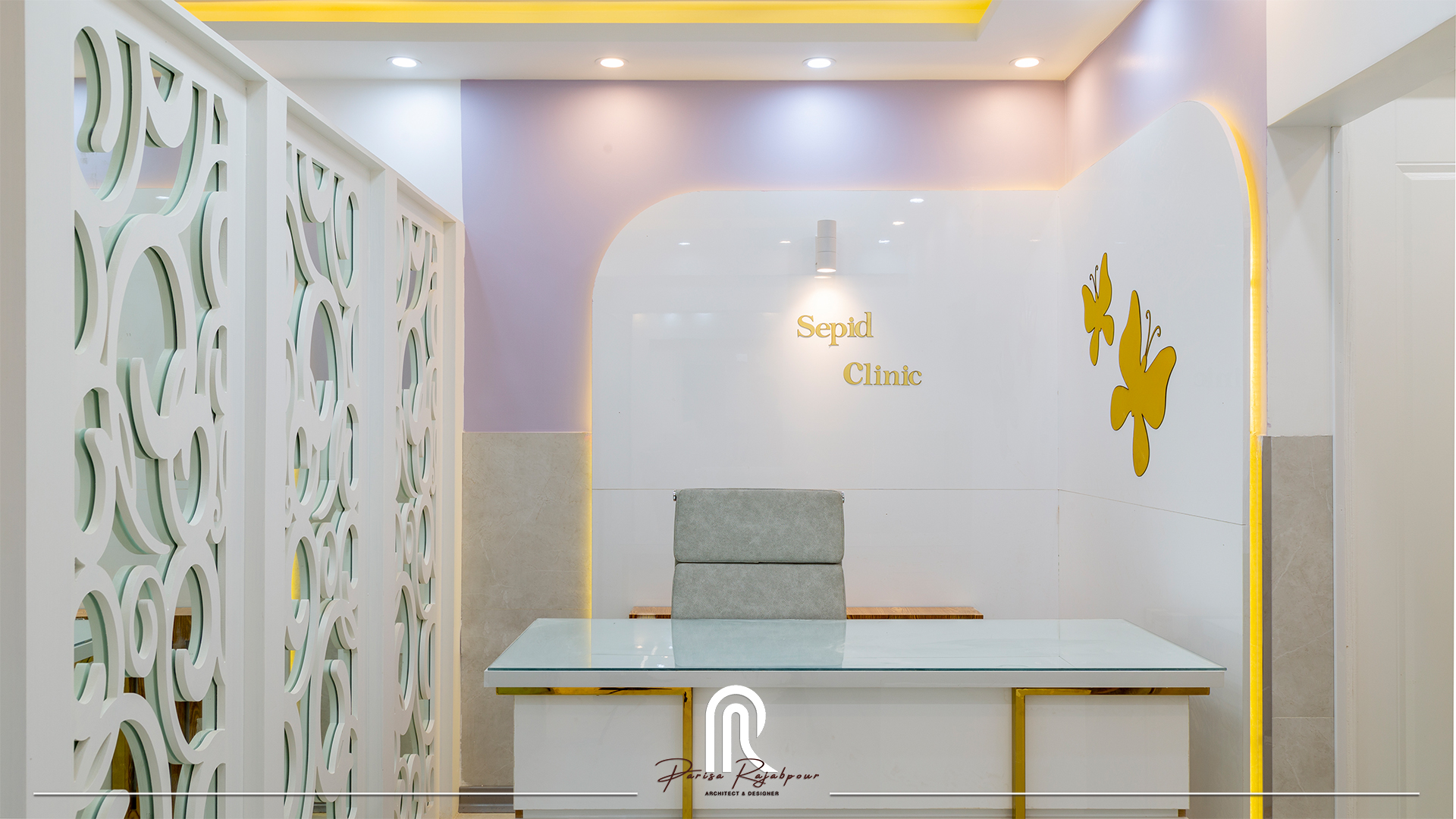 A white partition with delicate CNC patterns separates the waiting area from the examination space, maintaining privacy while giving the interior a refined and modern touch.