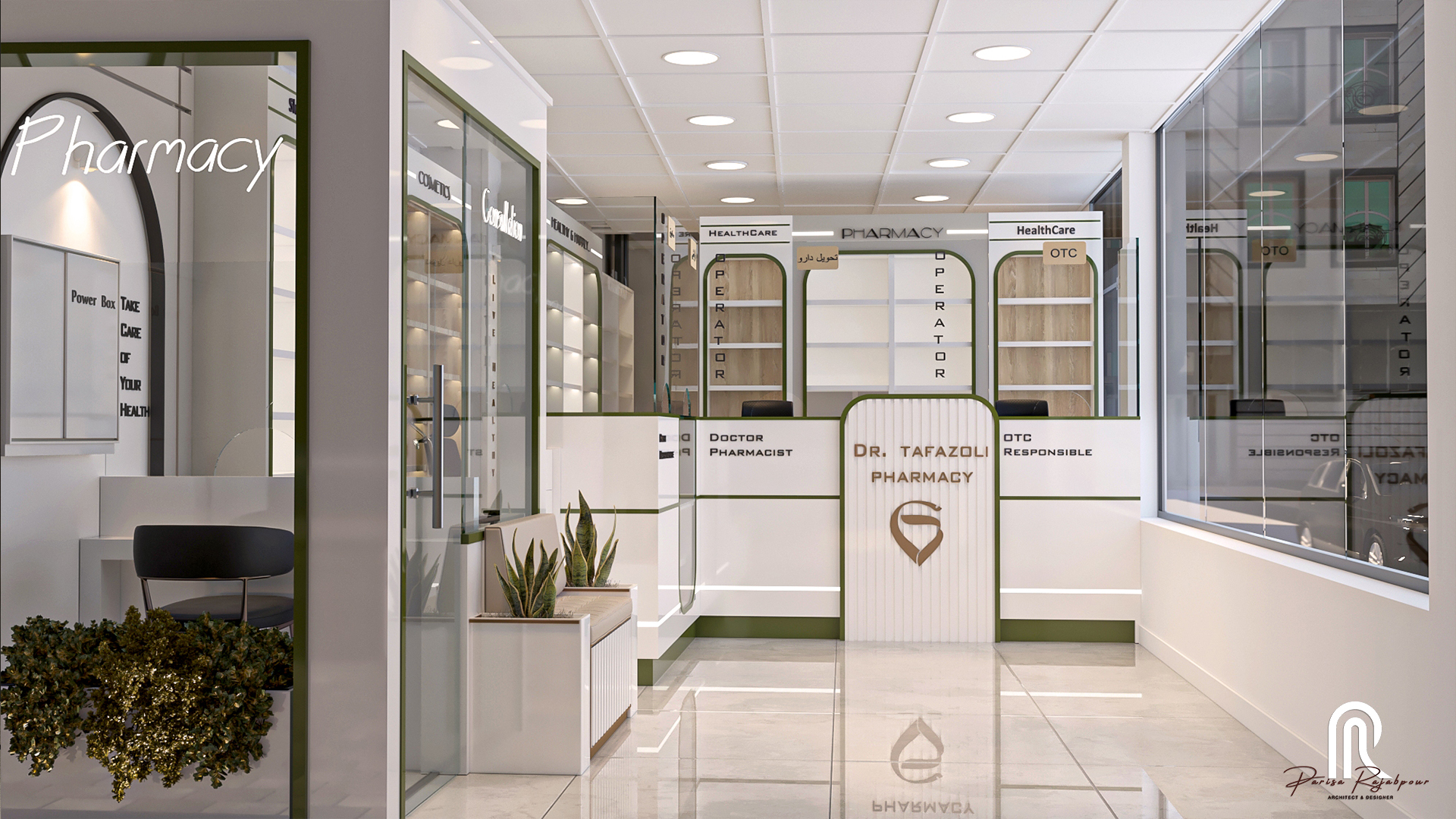 طراحی این داروخانه با سبک مدرن شکل گرفته است؛