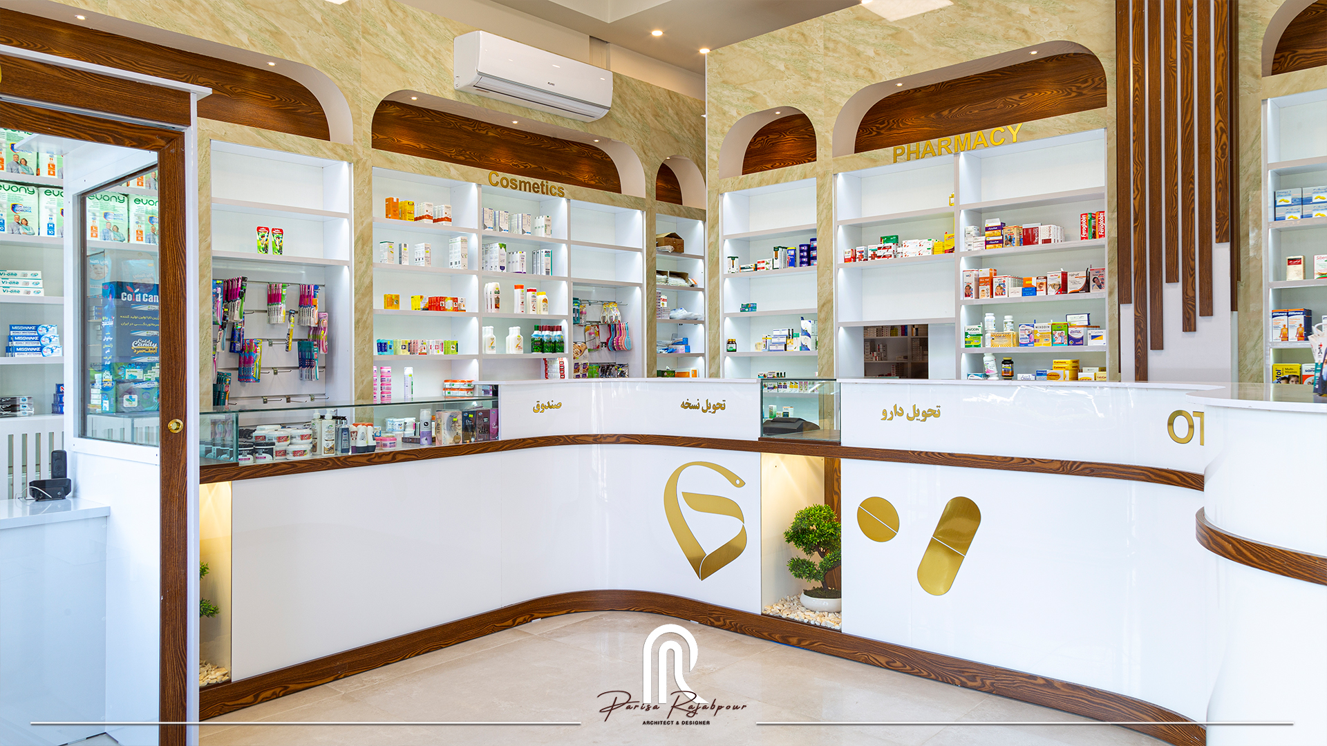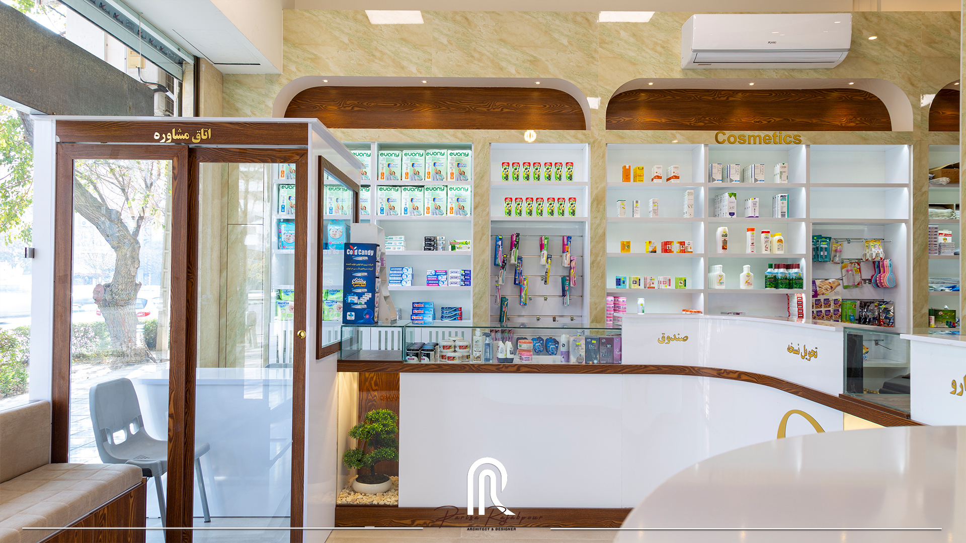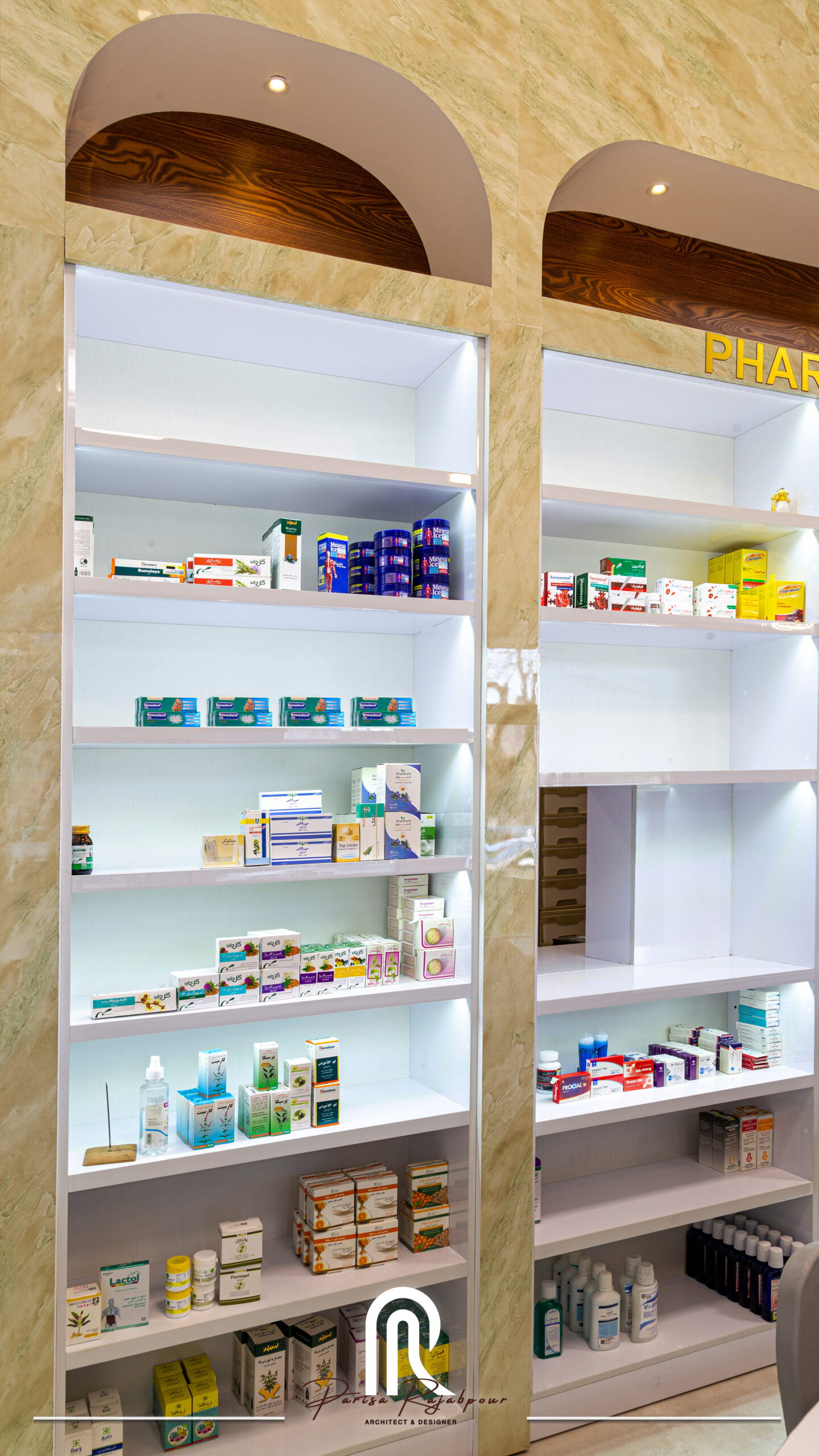 طراحی این داروخانه به سبک مدرن و کاربردی و بر پایه تضادهای سنجیده میان رنگها و بافتها شکل گرفته است؛