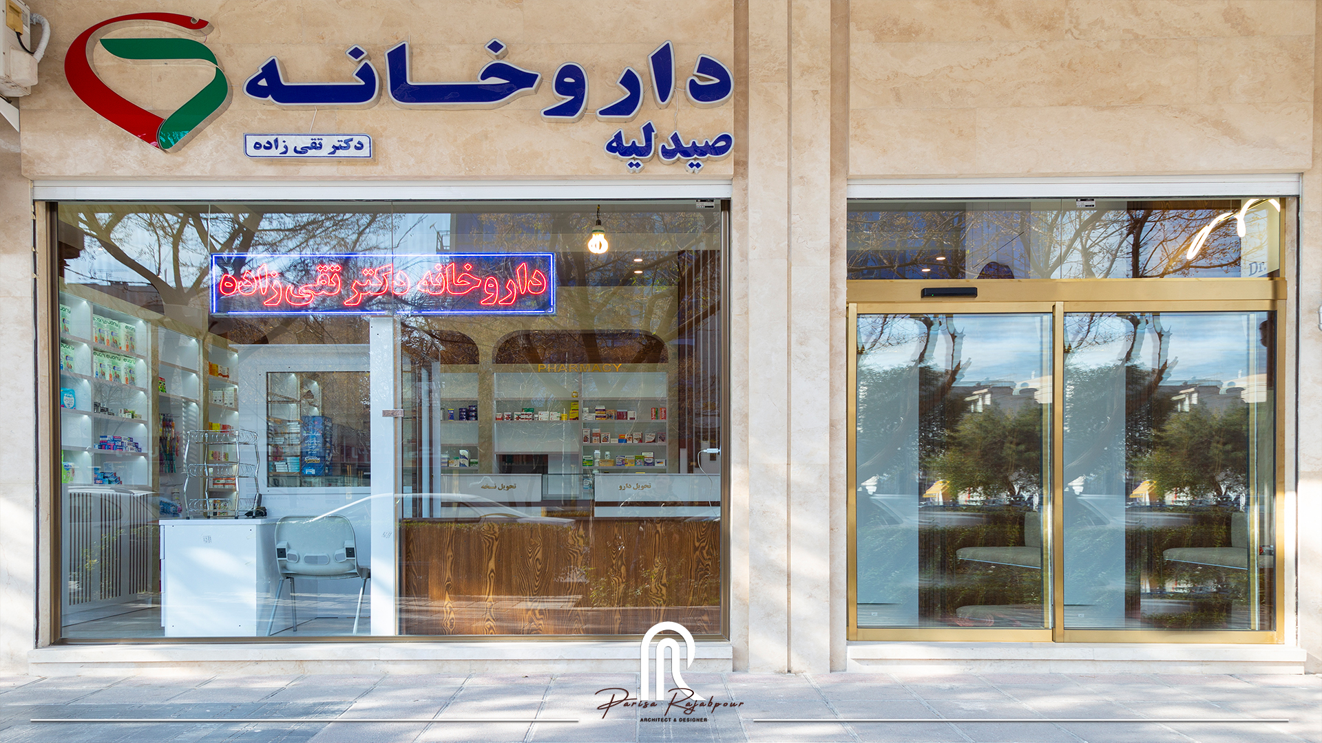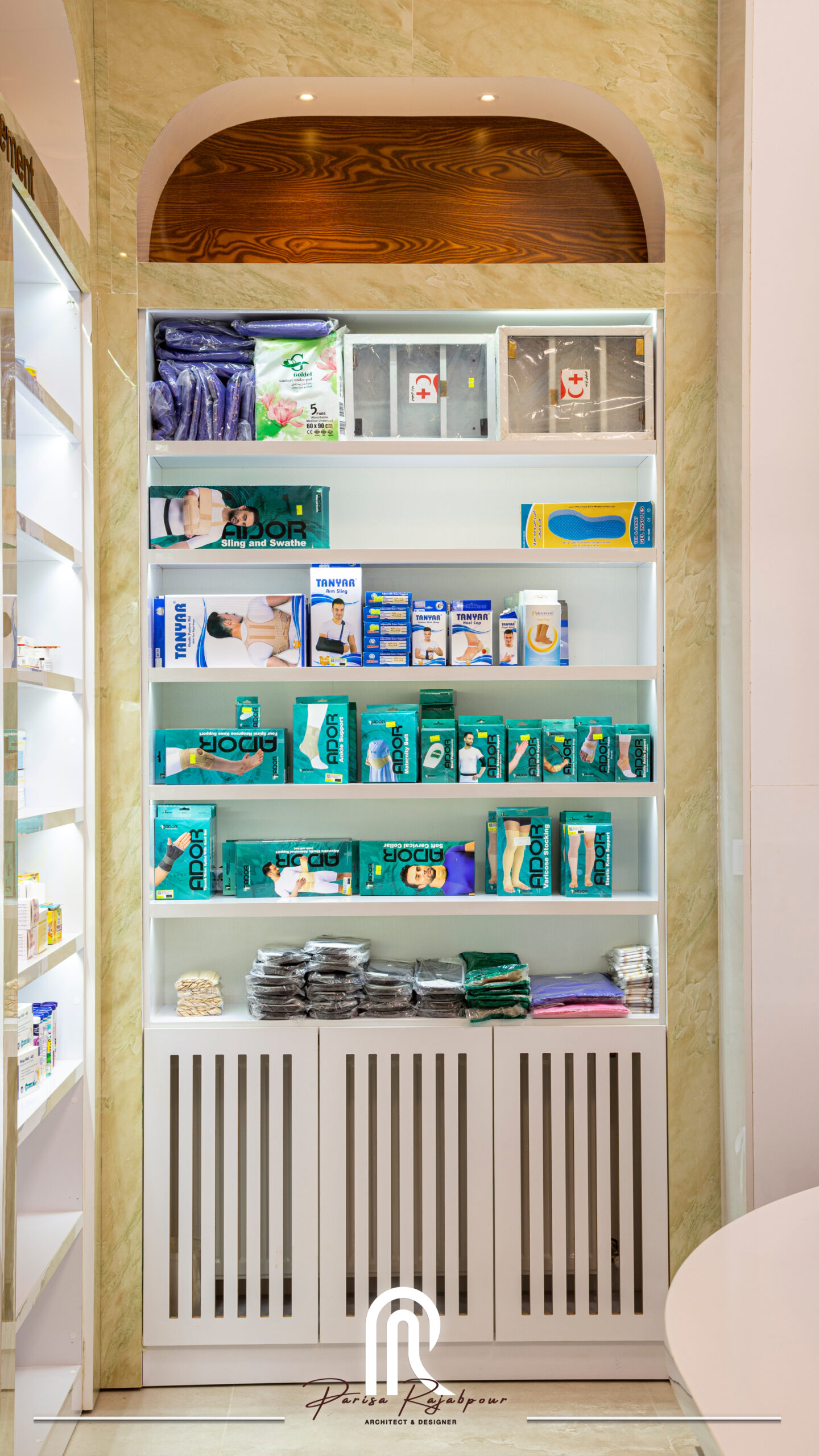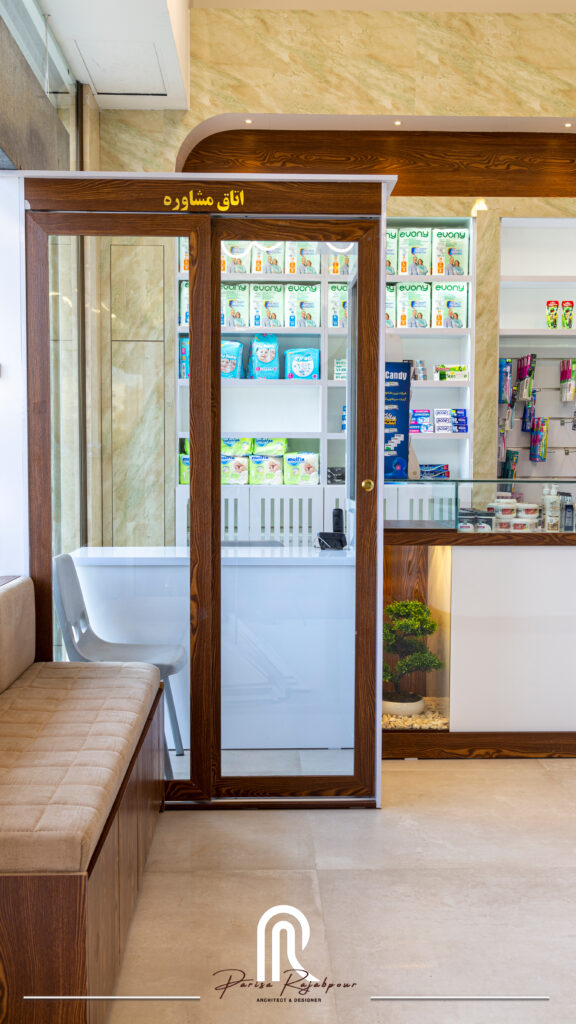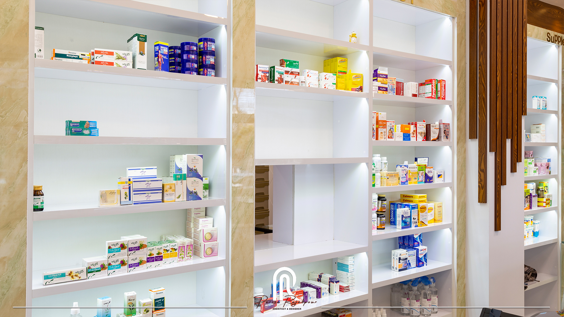 طراحی این داروخانه به سبک مدرن و کاربردی و بر پایه تضادهای سنجیده میان رنگها و بافتها شکل گرفته است؛