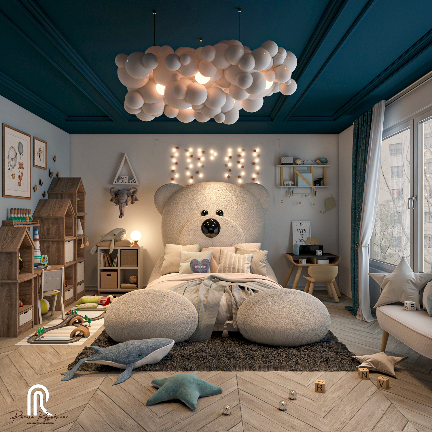 تختی با فرم یک خرس بزرگ، به مرکز دنیای کودک بدل شده؛ هم جایی برای استراحت است و هم موجودی دوستداشتنی که حضورش امنیت و آرامش میآورد. قفسههای چوبی به شکل خانههای کوچک، جایگاهی منظم و در عین حال سرشار از تخیل برای اسباببازیها فراهم کردهاند تا هر گوشهی اتاق، رنگی از رویا به خود بگیرد.