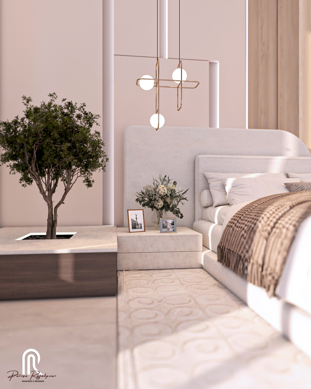 کف روشن با سرامیک مات کرم مایل به سفید، زمینهای آرام و خنثی ایجاد کرده تا نقطهی شروعی برای این تجربهی مینیمالیستی باشد. دیوار پشت تخت، با ترکیبی از چوب روشن و کرم ملایم، تعادلی نرم میان گرما و سادگی ساخته و نگاه را بهسادگی هدایت میکند. تختخواب و مبلمان سفید، در میانهی فضا قرار گرفتهاند و حالتی از خلوص و بیتکلفی را به اتاق بخشیدهاند. در کنار تخت، باغچهای کوچک با یک تکدرختچه، جزئی متفاوت و خاص است که میان آرامش و سادگی فضا، حس زندگی و تازگی را وارد میکند.