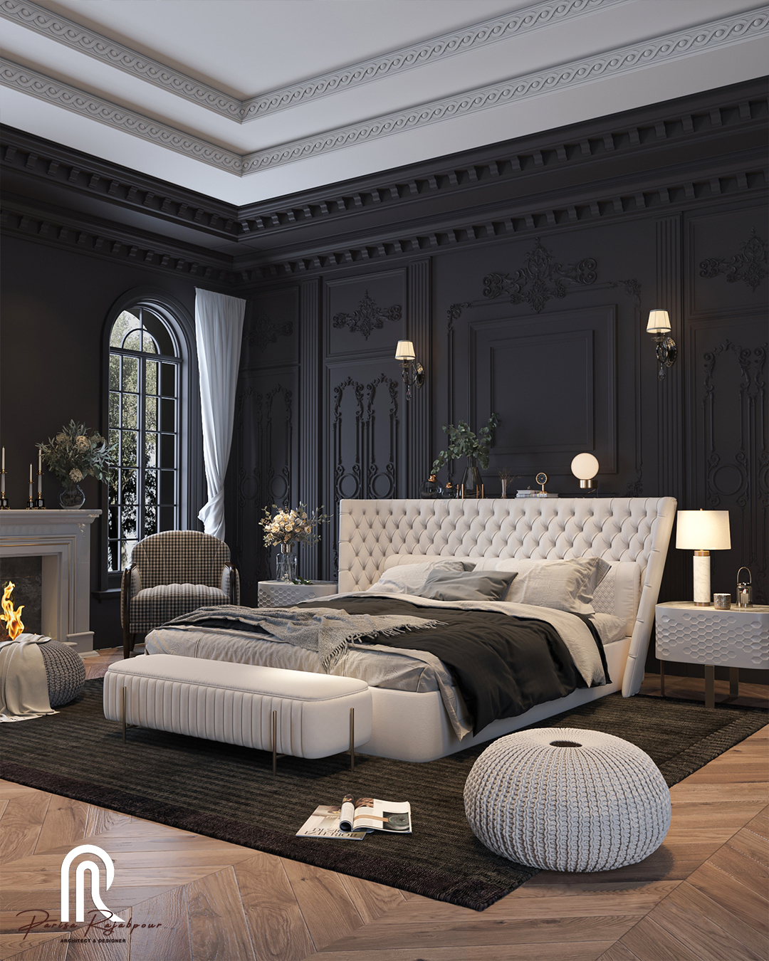 اتاق خوابی که در این طراحی شکل گرفته، بیش از آنکه صرفاً محلی برای استراحت باشد، بیانی شاعرانه از تضاد، تعادل و ظرافت است. رنگ سیاه در دیوارها بهعنوان عنصری شاخص انتخاب شده تا عمق و وقار خاصی به فضا ببخشد؛ درحالیکه ابزارهای نئوکلاسیک بر دیوارهها، با خطوط نرم و ظریف خود، از سنگینی فضا کاسته و جلوهای اصیل و پرجزئیات خلق کردهاند. این ترکیب، مرزی میان مدرنیته و ریشههای کلاسیک بنا نهاده و اتاق را از یک فضای معمولی فراتر برده است.